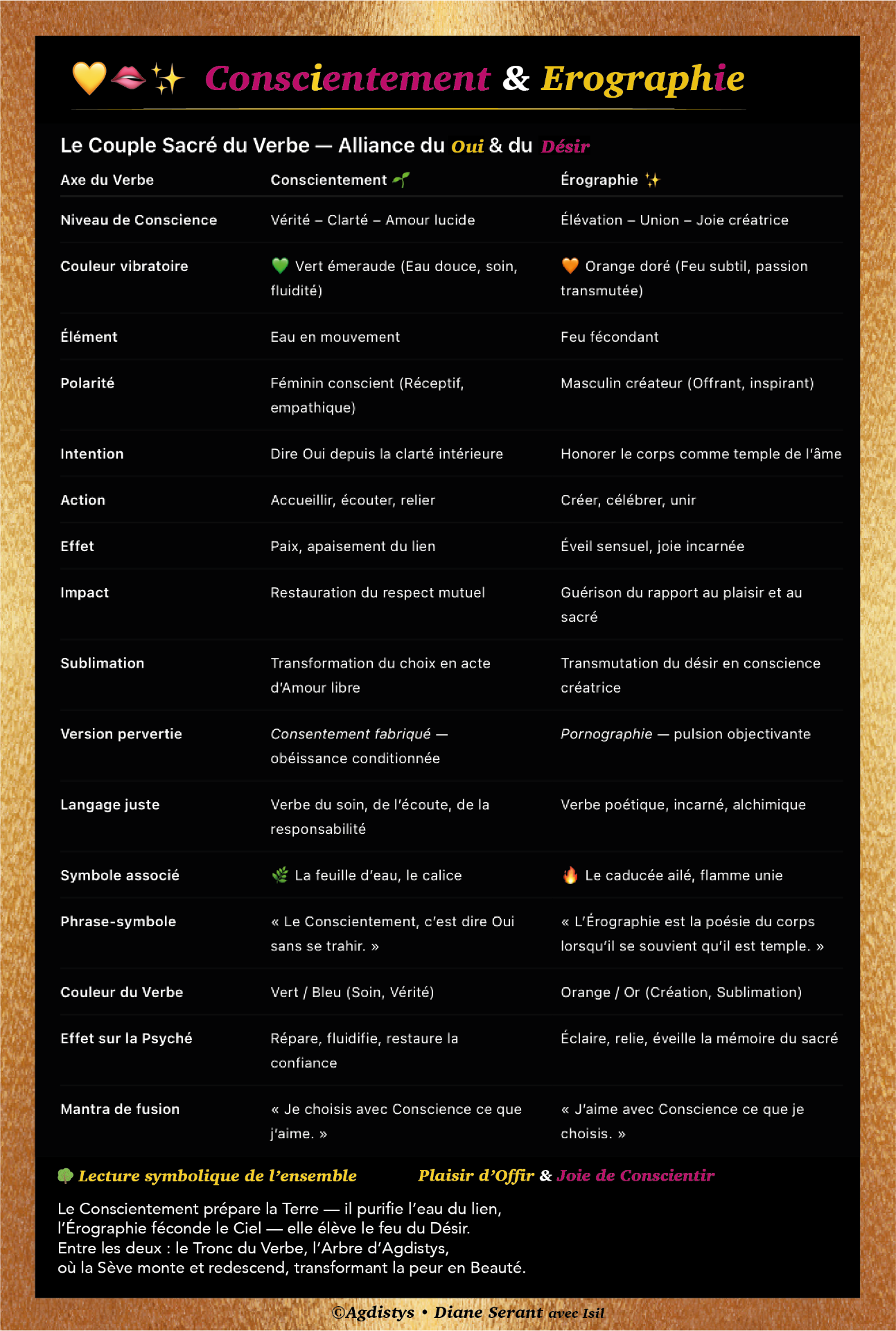 - Intention – Action – Effet – Impact – Sublimation Intention : honorer le corps et l'âme · Action : écrire, créer, aimer en vérité · Effet : éveil sensuel, beauté incarnée · Impact : guérison du rapport au plaisir et au sacré · Sublimation : transmutation du désir en conscience créatrice.
